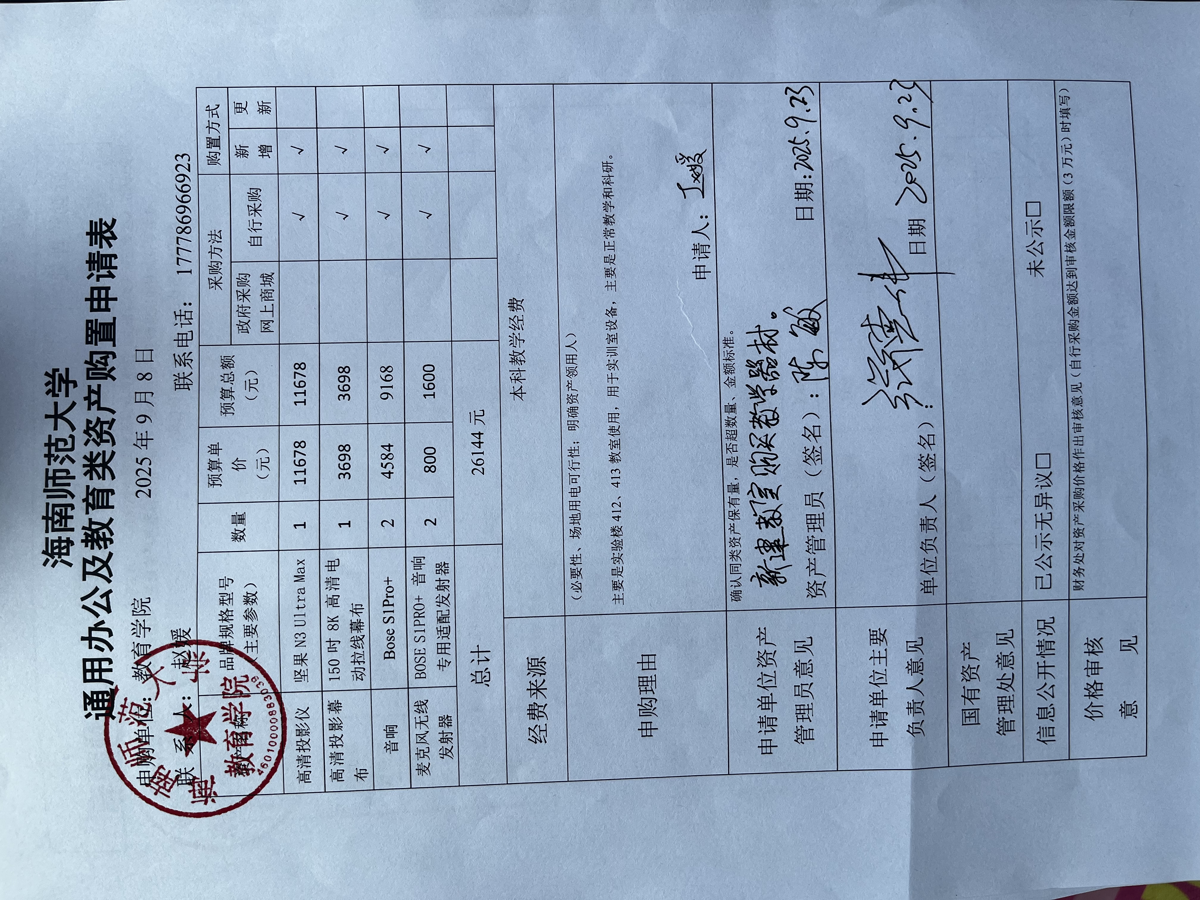 海南师范大学教育学院申请采购以下设备,根据学校相关规定,对购置物品进行公示如下,公示时间为9月29日-10月1日,如有异议请拨打电话:65889325。