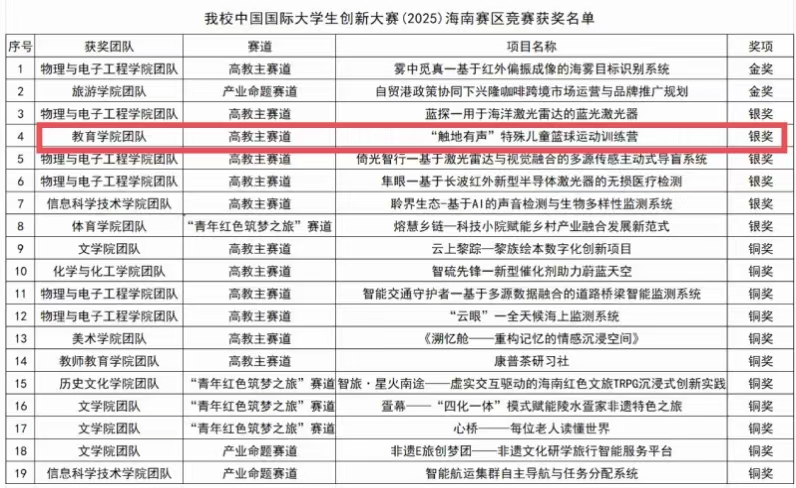 10月30日,中国国际大学生创新大赛 (2025) 海南赛区竞赛颁奖典礼在海南大学举行。热烈祝贺教育学院戴慧群老师指导的“‘触地有声’特殊儿童篮球运动训练营”荣获2025届中国国际大学生创新比赛海南区银奖。