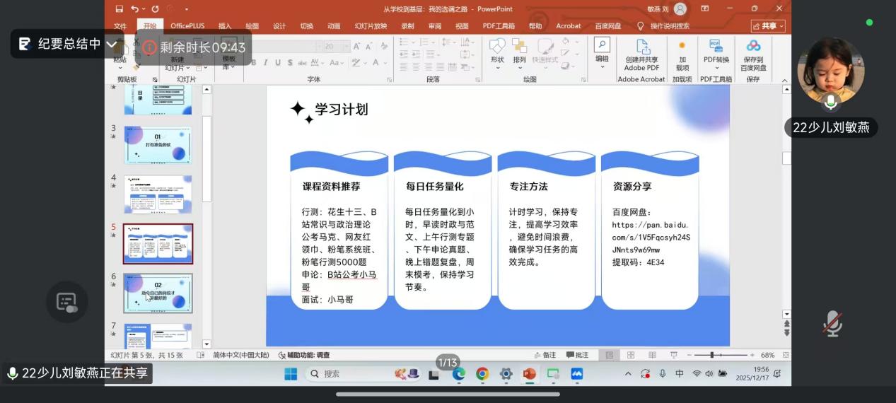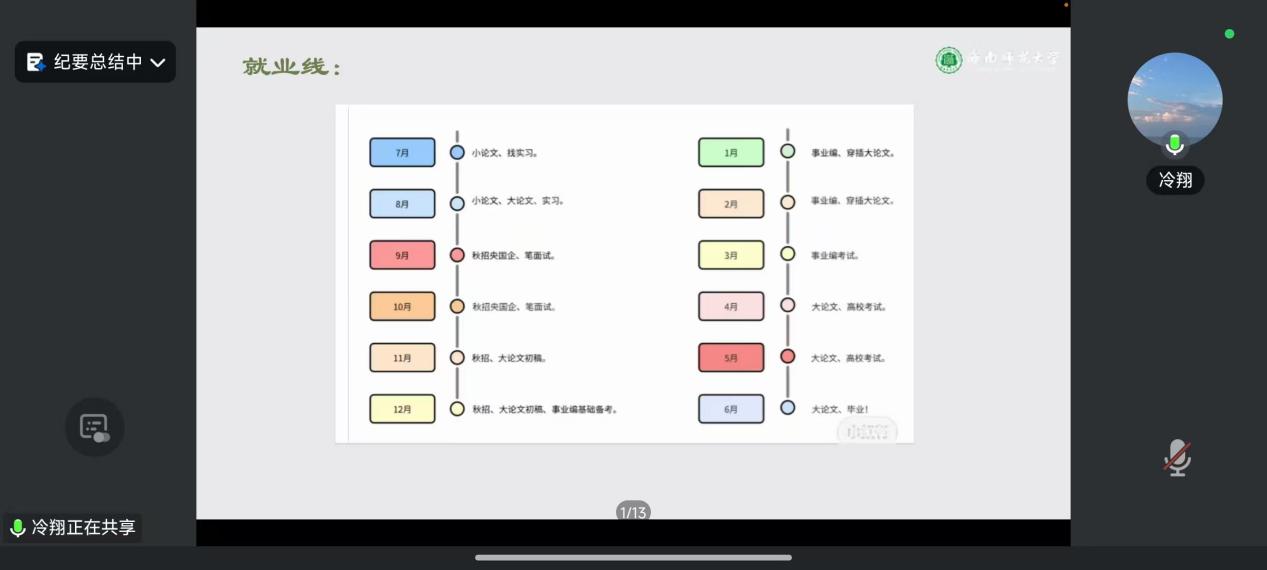 首先,冷翔同学围绕读研关键阶段,系统梳理了毕业论文推进的核心时间节点与高校辅导员求职的备考重点,既明确了论文撰写、查重、答辩的核心流程,也给出了招聘考试的备考方向,同时提醒大家合理分配时间,兼顾论文修改与求职备考的进度,提升准备效率。