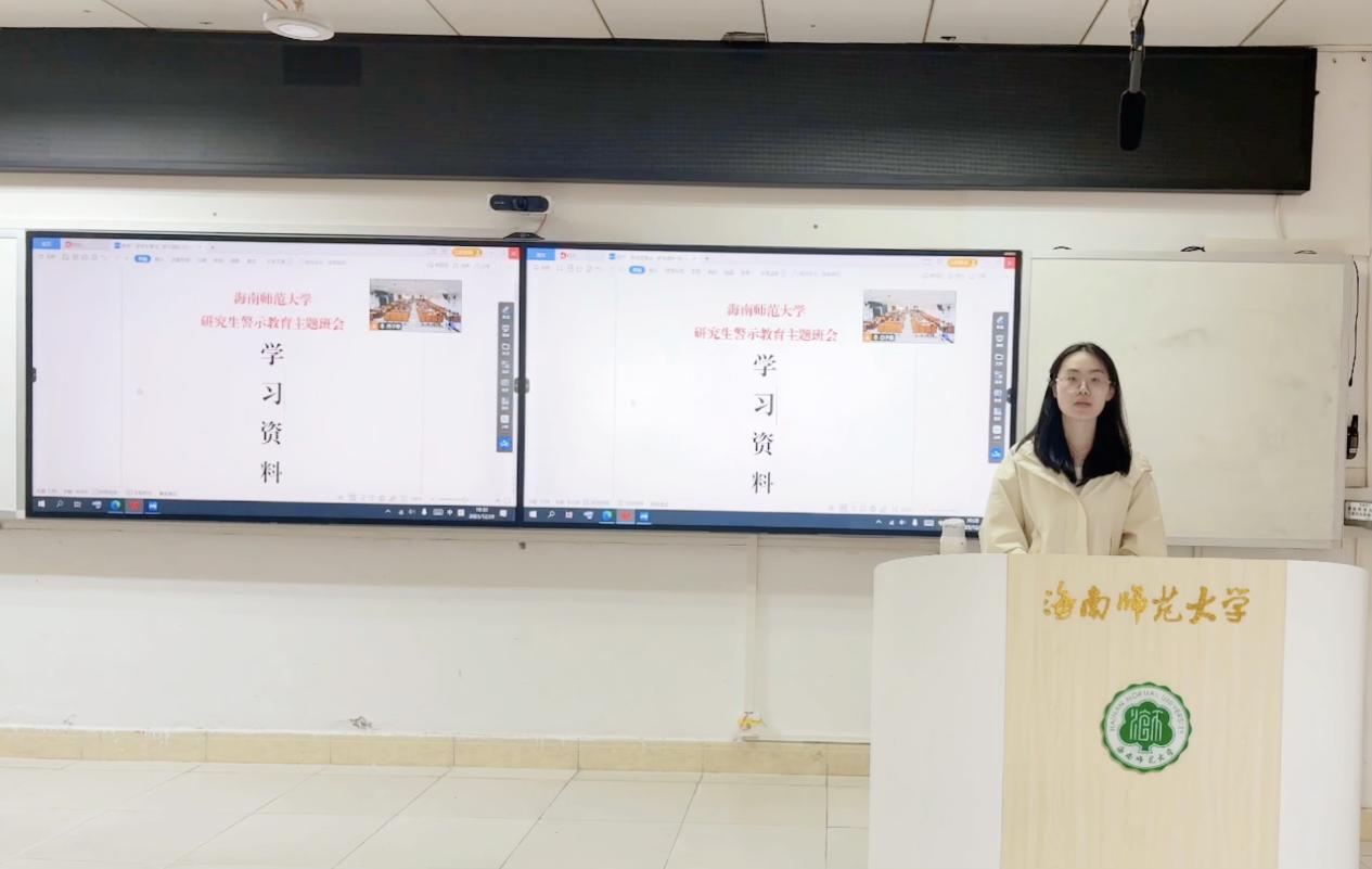 为强化全体同学的意识形态安全防线,进一步强化风险防控意识,2025年12月29日10:00,教育学院全体研究生分别于桂林洋校区第二公共教学楼209教室、龙昆南校区田家炳楼104教室,同步开展了警示教育主题班会。会上,学院党委副书记张欢出席并讲话。