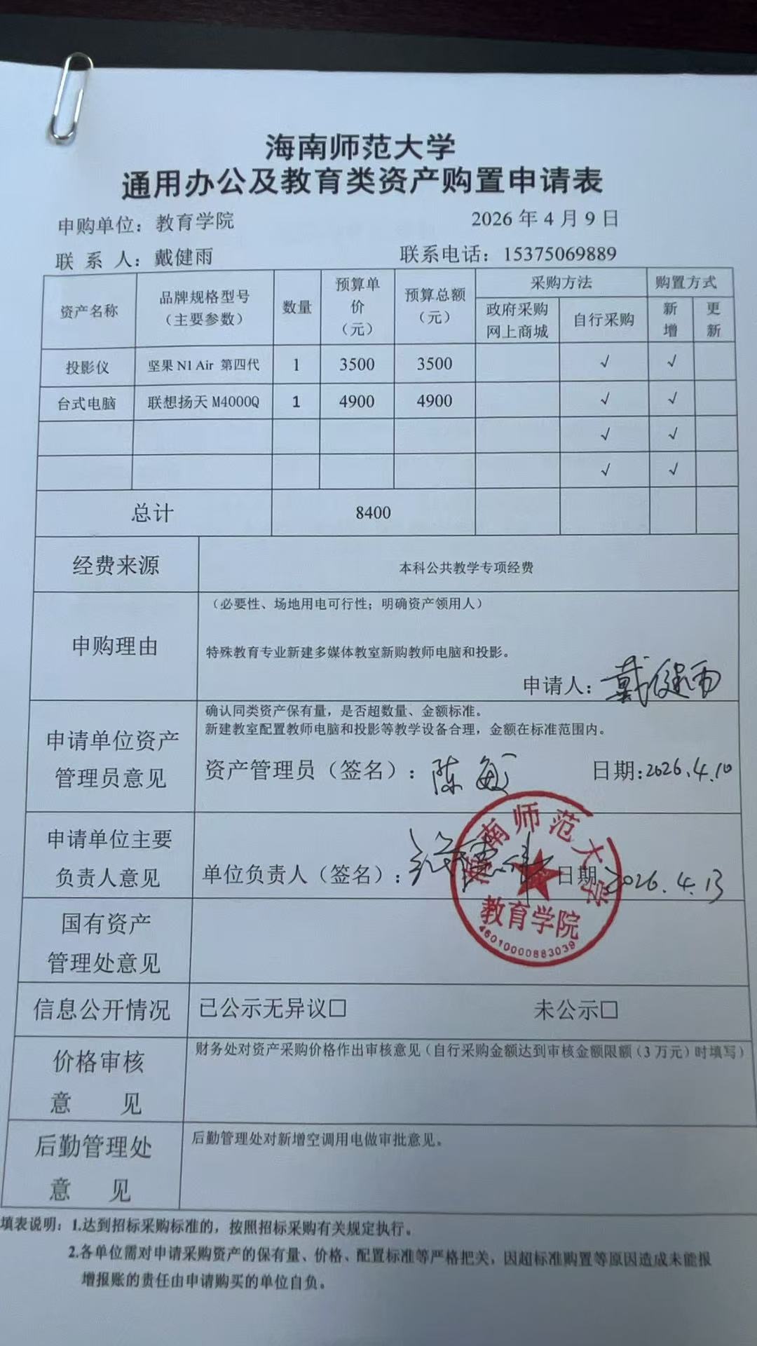 海南师范大学教育学院申请采购以下设备,根据学校相关规定,对购置物品进行公示如下,公示时间为4月14日-4月16日,如有异议请拨打电话:65889325